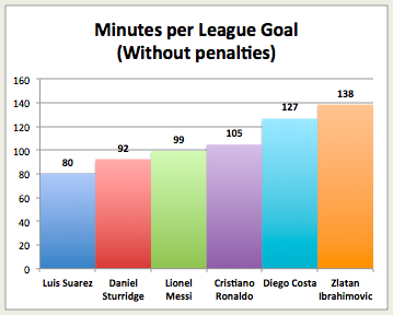 Kaikki huippusarjat mukaan lukien Luis Suarezin maalimäärä suhteessa peliaikaan on paras ja Daniel Sturridgen toiseksi paras ennen kaikkien tunnustamia supertähtiä Lionel Messiä ja Cristiano Ronaldoa sekä myös Diego Costaa ja Zlatan Ibrahimovicia.