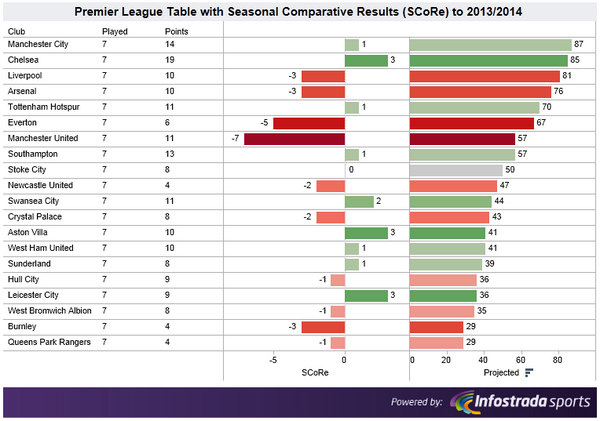 Man Utd (-7) and Everton (-5) are the only PL clubs who are more than 3 points away from points gained in equivalent seven matches last term