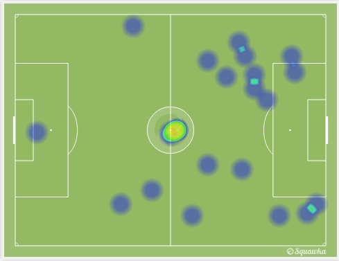 Balotellin lämpökartta ottelusta, kertoo parhaiten miehen näkymättömyyden. Suurin osa miehen pallonhallinasta tapahtui keskiympyrässä, kun joukkue sai aloittaa ottelun kolme kertaa uudestaan vastustajan maalien jälkeen.