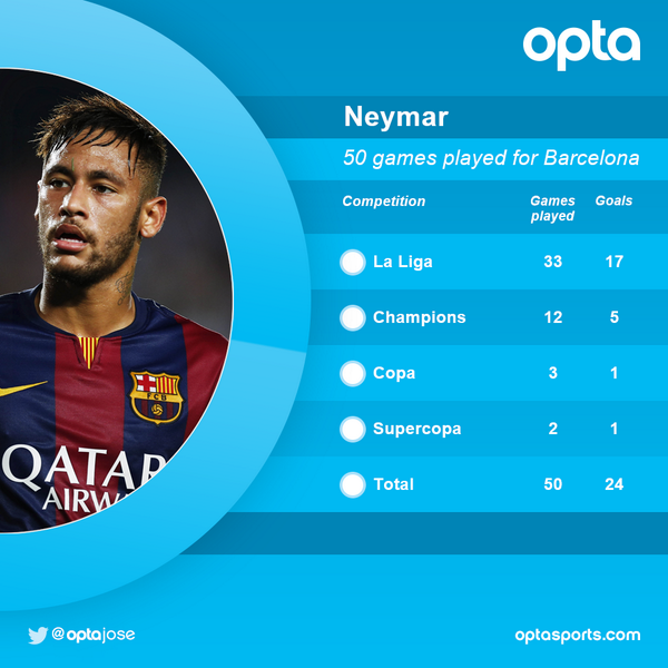 Brassitähti Neymar pelasi viikonloppuna 50 ottelunsa Barcelonan paidassa siirryttyään seuraan kesällä 2013 kotimaansa Santosista.