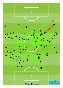 Mies kirjautti kilometrejä kentällä ripauksen verran yli 11 ja sai peräti 98 prosenttia syötöistään perille. Tarkempien tilastojen mukaan hän rakensi yhden maalipaikan ja sai 7/7 pitkää syöttöään perille. Pallokosketuksia oli kaikkiaan 99 kappaletta. Suurempaan määrään ylsivät vain täyden peliajan kentällä olleet Luka Modric (108) ja Isco (104).
