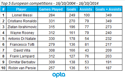 Messi on tehnyt 249 maalia ja antanut 100 maalin johtannutta syöttöä. Ronaldon lukemat ovat 270+79.