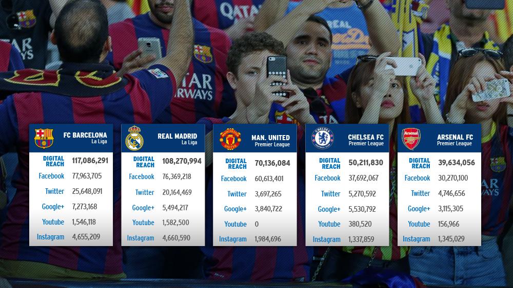 Kun lasketaan seuraajat Facebookista, Twitteristä, Google+:sta, YouTube:sta ja Instagramista on seura jalkapallomaailman ykkönen.