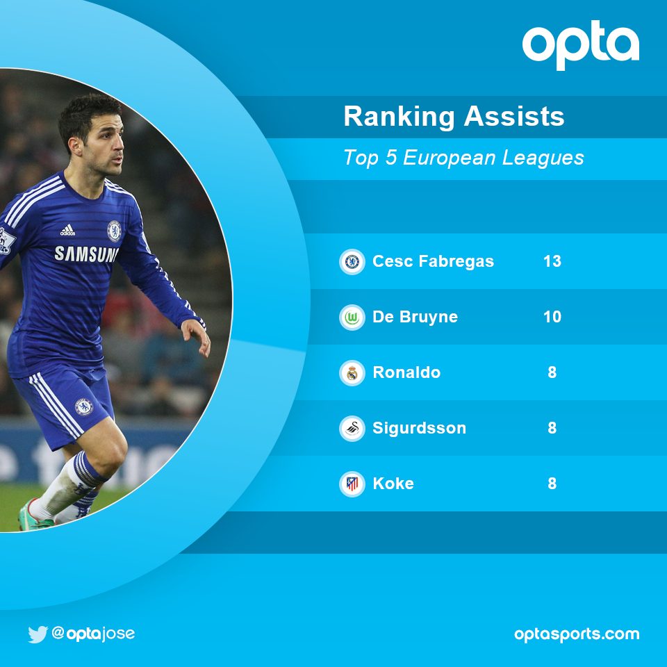 Chelsean maalin syöttänyt Cesc Fabregas nosti maalisyöttöjensä määrän tällä kaudella jo 13 kappaleeseen, mikä on suurin saldo Euroopan viiden suursarjan vertailussa.