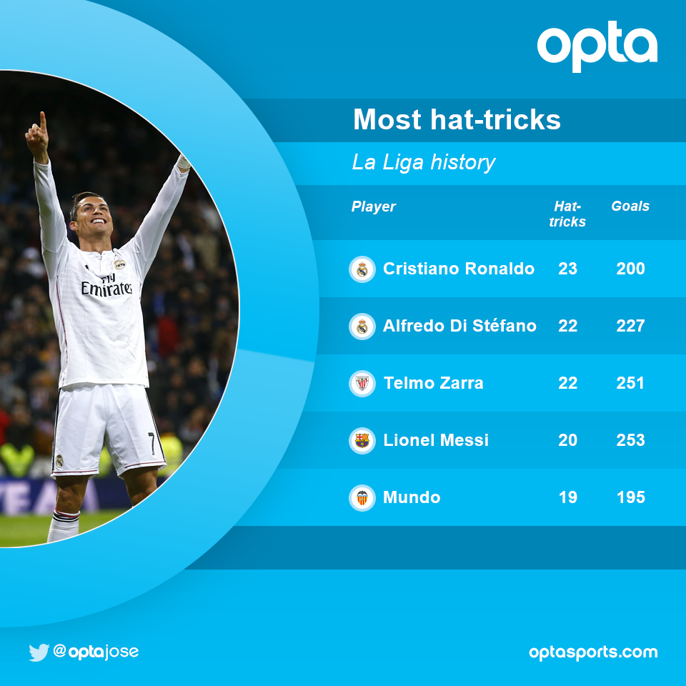 23 - @Cristiano Ronaldo has scored the most hat-tricks in La Liga history. Spectacular.