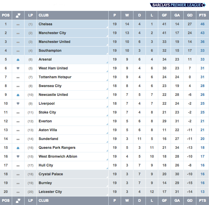 Heistä kahden pisteen päässä ovat West Ham ja Tottenham. Maanantaina Liverpoolin kanssa yhteen iskevät Swansea on kahdeksas 28 pisteellä eli vain viisi pistettä nelossijasta ennen illan peliään. Liverpool, voittamalla illan pelin, nousisi Swansean rinnalle.