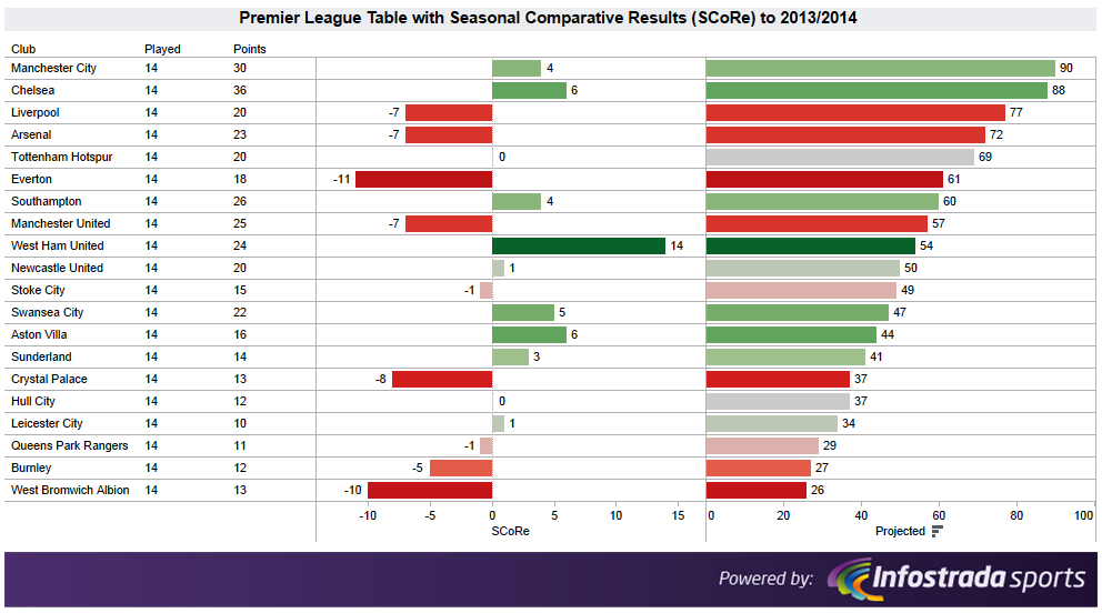 Alla kattava tilasto. Seurat on listattu siinä järjestyksessä, mikä on näiden ennakoitu pistemäärä kauden lopussa.