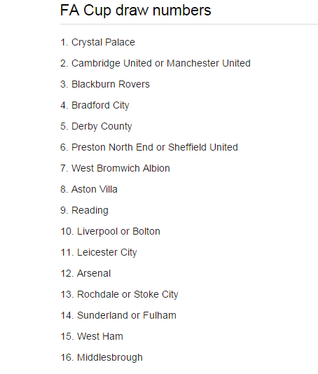 FA Cupin 5. kierroksen arvonta tapahtuu maanantaina klo 21.00 Suomen aikaa. Alla näet arvontanumerot joukkueille. Uusinnat pelataan helmikuun alussa ja viides kierros on ohjelmassa helmikuun puolessa välissä.