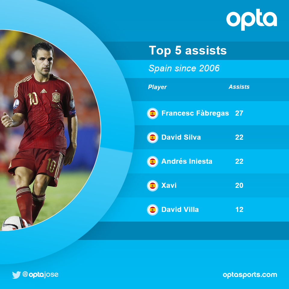 Fabregasin pelisilmä on kiistattomasti maailman huippua. Tästä kertoo Valioliiga-menestyksen lisäksi myös maalisyöttötilasto Espanjan maajoukkueesta.