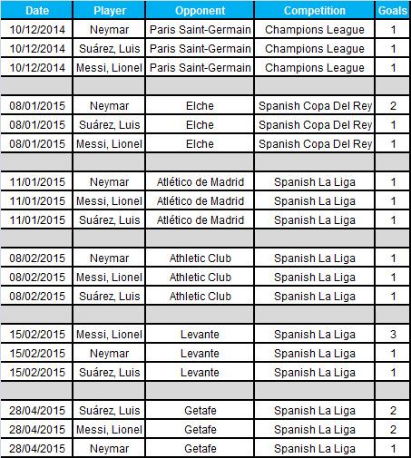 Lionel Messi, Luis Suarez and Neymar have scored 102 goals between them in 52 games for Barcelona this season.
