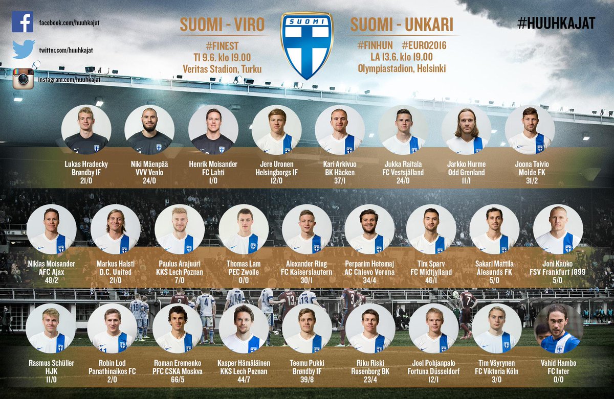 A-maaottelu Suomi-Viro pelataan Veritas Stadionilla Turussa tiistaina 9.6. kello 19.00. EM-karsintaottelu Unkari-Suomi pelataan Olympiastadionilla Helsingissä lauantaina 13.6. niin ikään kello 19.00. Ennen varsinaista kokoontumista otteluihin Huuhkajaryhmä leireilee alkaneella viikolla 2. – 5.6.