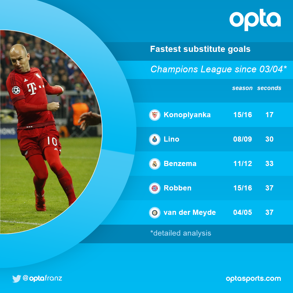 37 - Arjen Robben from @FCBayernEN scored 37 seconds after being subbed in, with his 1st touch. Lightning. #FCBARS