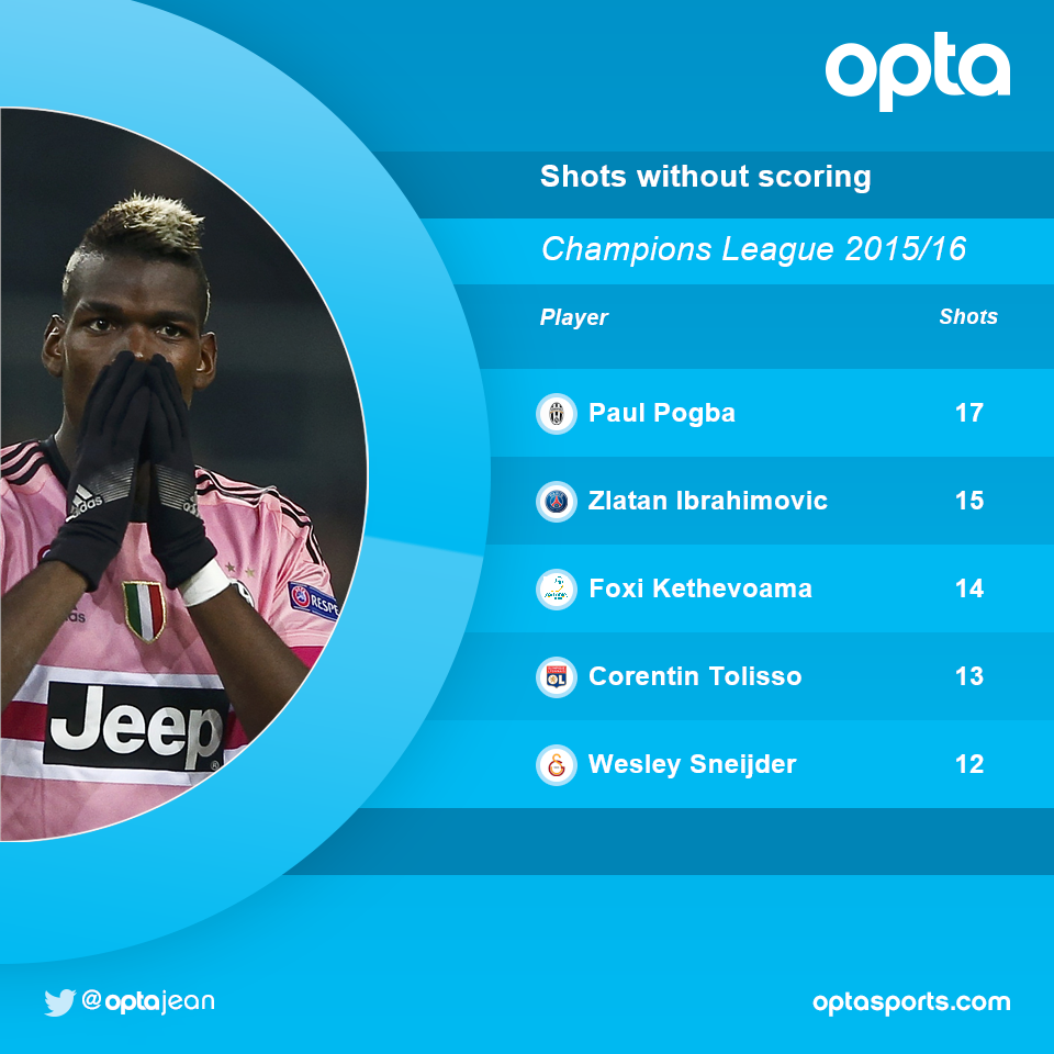 Pogba on kuluvan kauden Mestarien liigassa laukonut 17 kertaa, mutta ei ole tehnyt maaliakaan. Hän on tämän, ei niin mairittelevan tilaston ykkönen kilpailussa.¨