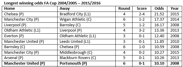 Infostradalive-tilastoyhtiön analyytikon Simon Gleaven koostamien vedonlyöntikertoimien perusteella vuosikymmenen suurin yllätys FA Cupissa on ollut Chelsean 2-4-lukemin tullut tappio kolmannen sarjatason Bradfordille viime kaudella kilpailun 4. kierroksella, vielepä vierakentällä.