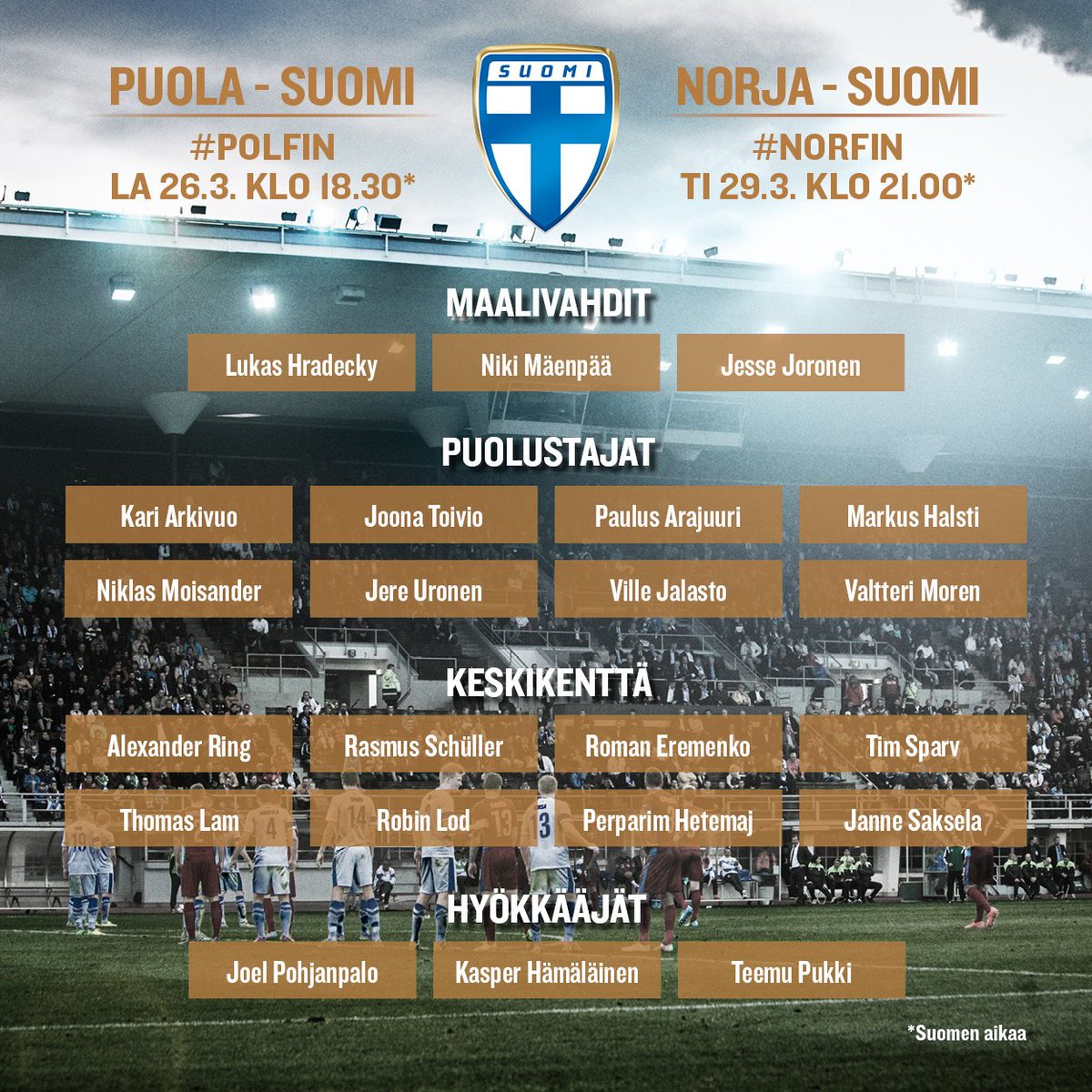 Huuhkajat kohtaa ensin Puolan lauantaina 26. maaliskuuta klo 18.30 ja sitä seuraavana tiistaina Norjan klo 21.00. Molemmat ottelut pelataan vieraissa.