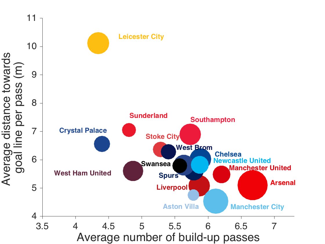 Leicesterin tapa pelata on täysin poikkeuksellinen myös Valioliigan sisäisessä vertailussa. Joukkue on täysin omassa kategoriassaan, kun katsotaan etenemismatkaa yhdellä onnistuneella syötöllä ja ns. rakentavien syöttöjen määrää (kts. graafi alla) eli joukkue hyökkää äärimmäisen suoraviivaisesti. Tulevaisuus näyttää sen, saako Leicesterin pelitapa menestyviä matkijoita vai jääkö Claudio Ranierin luoma suoraviivainen, mutta toimiva pelitapa vain poikkeukseksi.