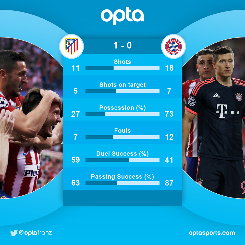 Atletico kaatoi Bayern Münchenin keskiviikkona joukkueiden ensimmäisessä välieräkohtaamisessa 1-0-lukemin Saul Niguezin messimäisellä soolomaalilla, vaikka saksalaiset vieraat hallitsivat peliä peräti 73-prosenttisesti. Laukausten määrässä saksalaiset olivat yhä edellä, mutta eivät niin selvästi ja todelliset huippupaikat laskettaessa oltiin aika tasoissa. Atletico pudotti jo edellisellä kierroksella Barcelonan, jonka peli nojaa samoihin teeseihin kuin Bayernin.