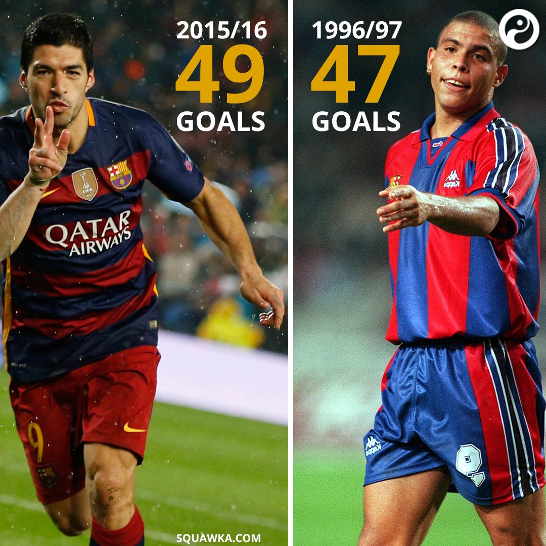 Luis Suarez rikkoi jo Barcelonassa 1990-luvulla lyhyen, mutta muistorikkaan pestin tehneen Ronaldon (siis sen brasilialaisen) yhden kauden maaliennätyksen.