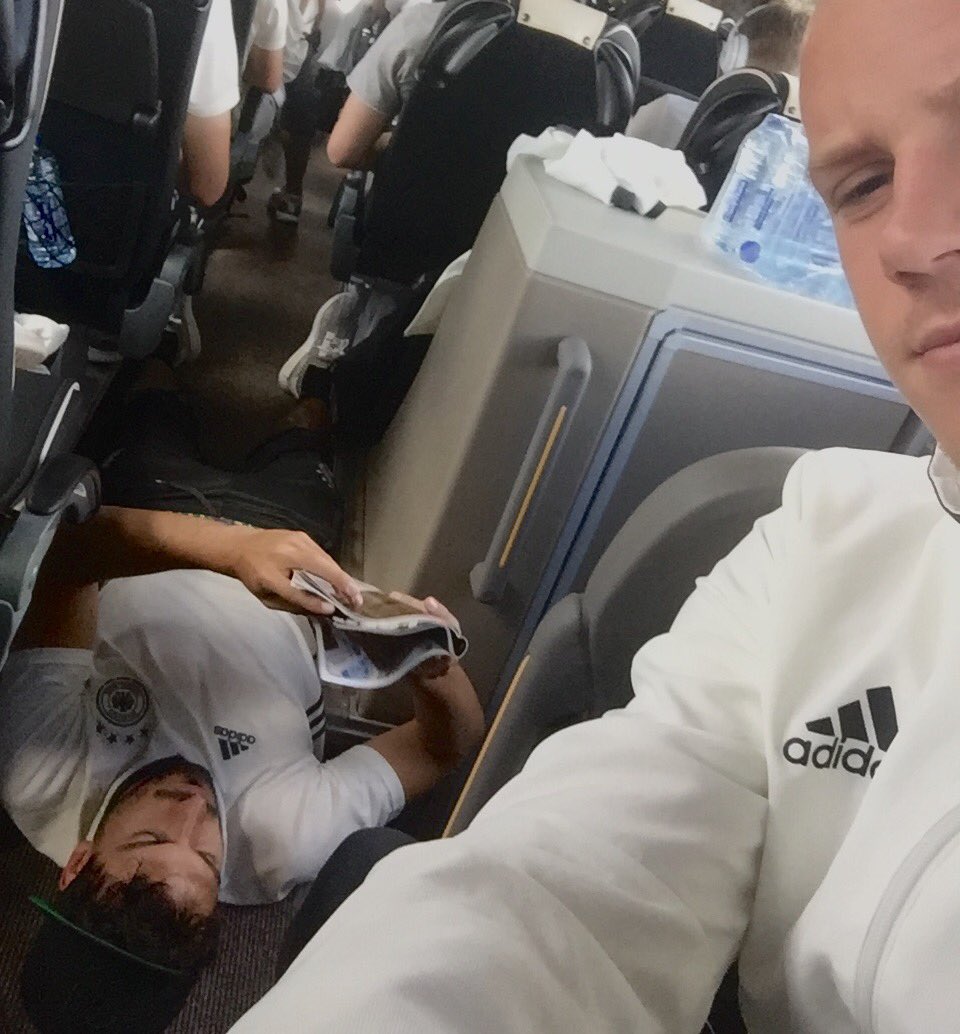 Maalivahti Marc-André ter Stegen otti kuvan, jossa tähtipuolustaja Mats Hummels makasi bussin lattialla lehteä lukien.