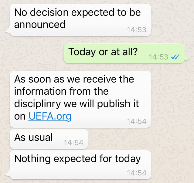 Papenkovin saaman viestin mukaan UEFA tiedottaa asiasta heti, kun kurinpito on tehnyt päätöksen. Venäläistoimittajan saaman viestin mukaan päätöstä ei kuitenkaan kuulla vielä tänään, torstaina.