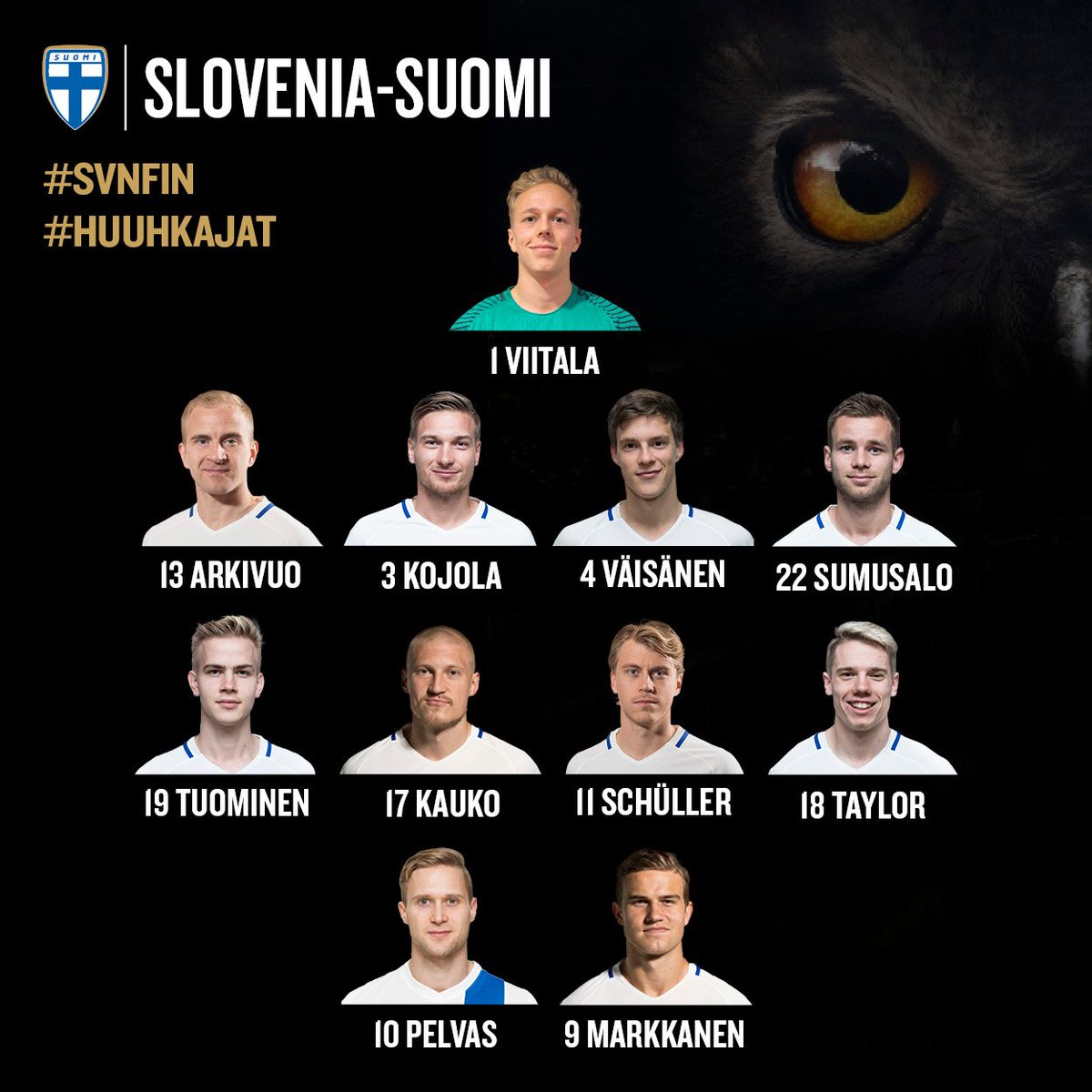 Suomen avaus klo 17.00 alkavaan A-maaotteluun Sloveniaa vastaan. Ottelu on katsottavissa suorana @VeikkausTV:stä. #SVNFIN #Huuhkajat