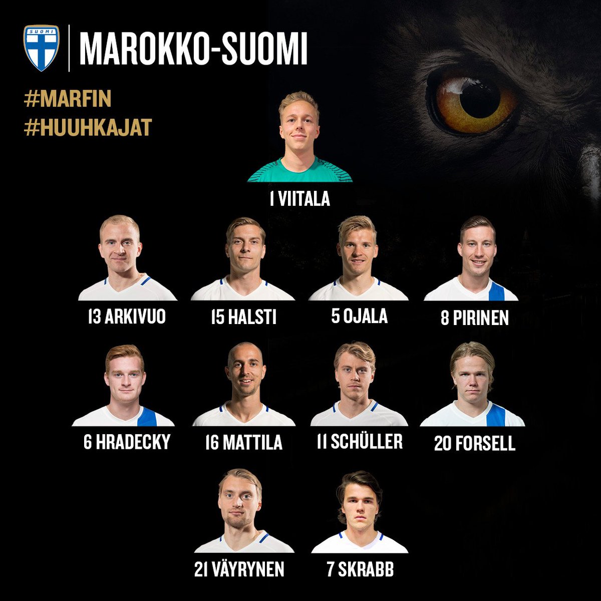 Suomen avaus klo 16.00 alkavaan A-maaotteluun Marokkoa vastaan. Ottelu on katsottavissa suorana @VeikkausTV:stä. #MARFIN #Huuhkajat