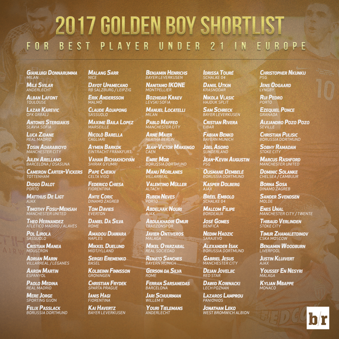 Vuoden 2017 Golden Boy -ehdokkaat näet alla olevassa kuvassa. Jos et näe, voit katsoa sen täältä.