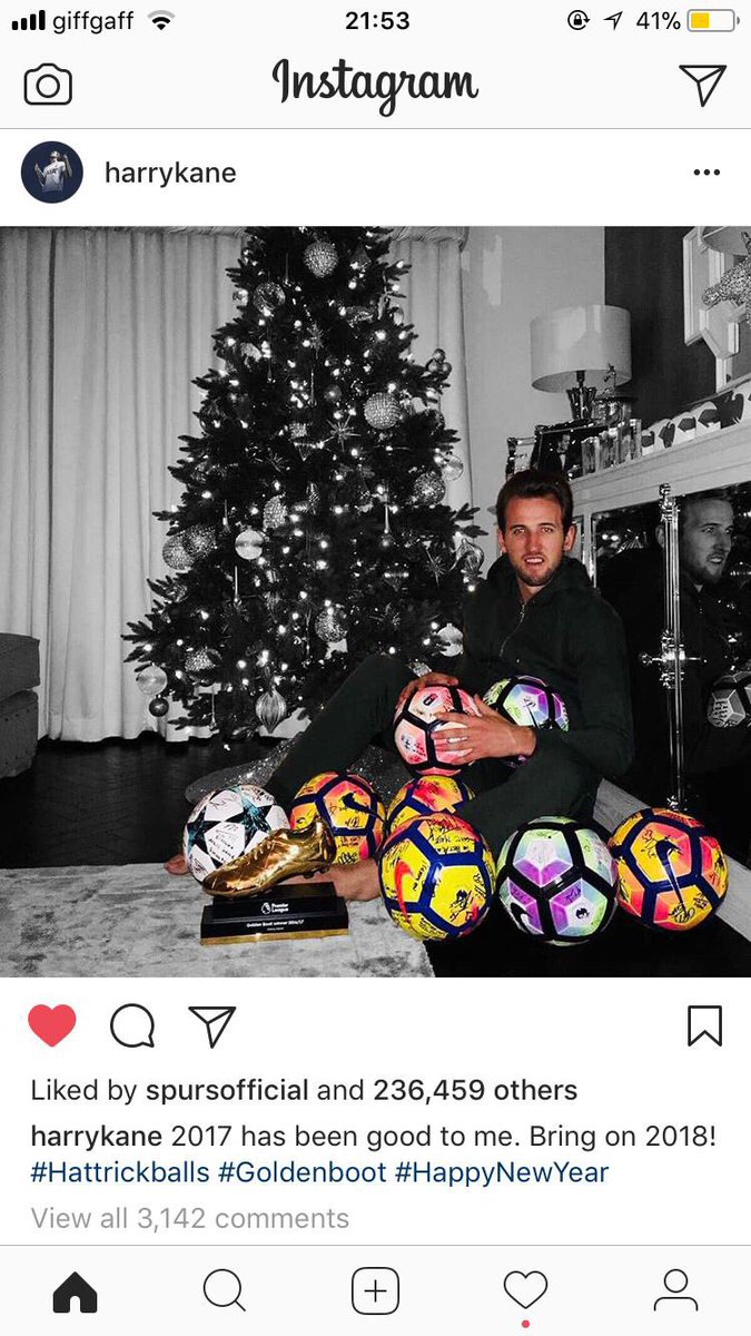 Kane lisäsi Instagram-tililleen kuvan, jossa hän poseeraa Valioliigan kultaisen kengän eli parhaan maalintekijän palkinnon sekä kahdeksan hattutemppupallon kanssa.