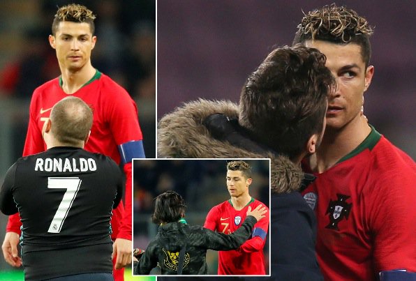 Noin tunnin kohdalla peliä toinen kannattajista juoksi nurmelle antaakseen suukon portugalilaiselle. Mies halusi ottaa myös yhteiskuvaa tähtipelaajan kanssa.