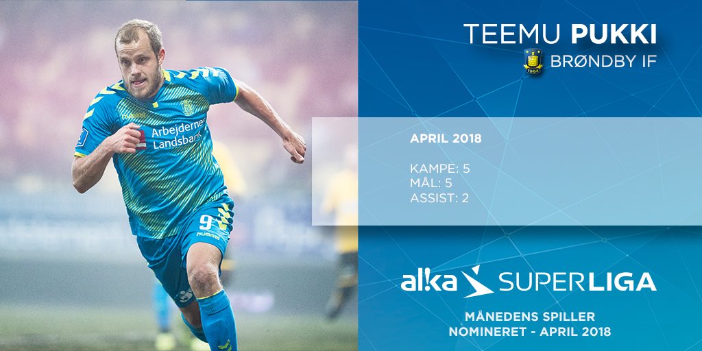 Tanskan liigan Bröndbyssä hyvää kautta pelaava Teemu Pukki on ehdolla sarjan kuukauden pelaajaksi, yhdessä seuratoverinsa Kamil Wilczekin, ja FC Kööpenhaminan Viktor Fischerin kanssa.