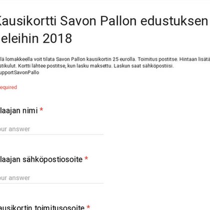 Tällä lomakkeella voit tilata Savon Pallon kausikortin 25 eurolla. Toimitus postitse. Hintaan lisätään postikulut. Kortti lähtee postitse, kun lasku maksettu. Laskun saat sähköpostiisi. #supportSav...