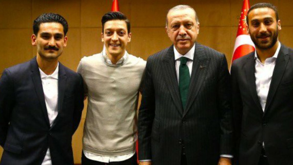 Turkkilaistaustaiset keskikenttäpelaajat nousivat otsikoihin, kun he tapasivat muutama viikko sitten Lontoossa Turkin ristiriitaisen ja itsevaltaisena pidetyn presidentin Recep Tayyip Erdoganin, ja suostuivat tämän kanssa yhteiskuviin. Gündogan lahjoitti Erdoganille vieläpä pelipaitansa, johon hän oli omakätisesti kirjoittanut turkinkielisen tekstin ”minun presidentilleni”.