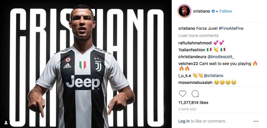 Ronaldo julkaisi henkilökohtaisella Instagram-tilillään kuvan itsestään Juventuksen pelipaidassa, kun siirto oli varmistunut. Kuvatekstissä luki ”Forza Juve”.