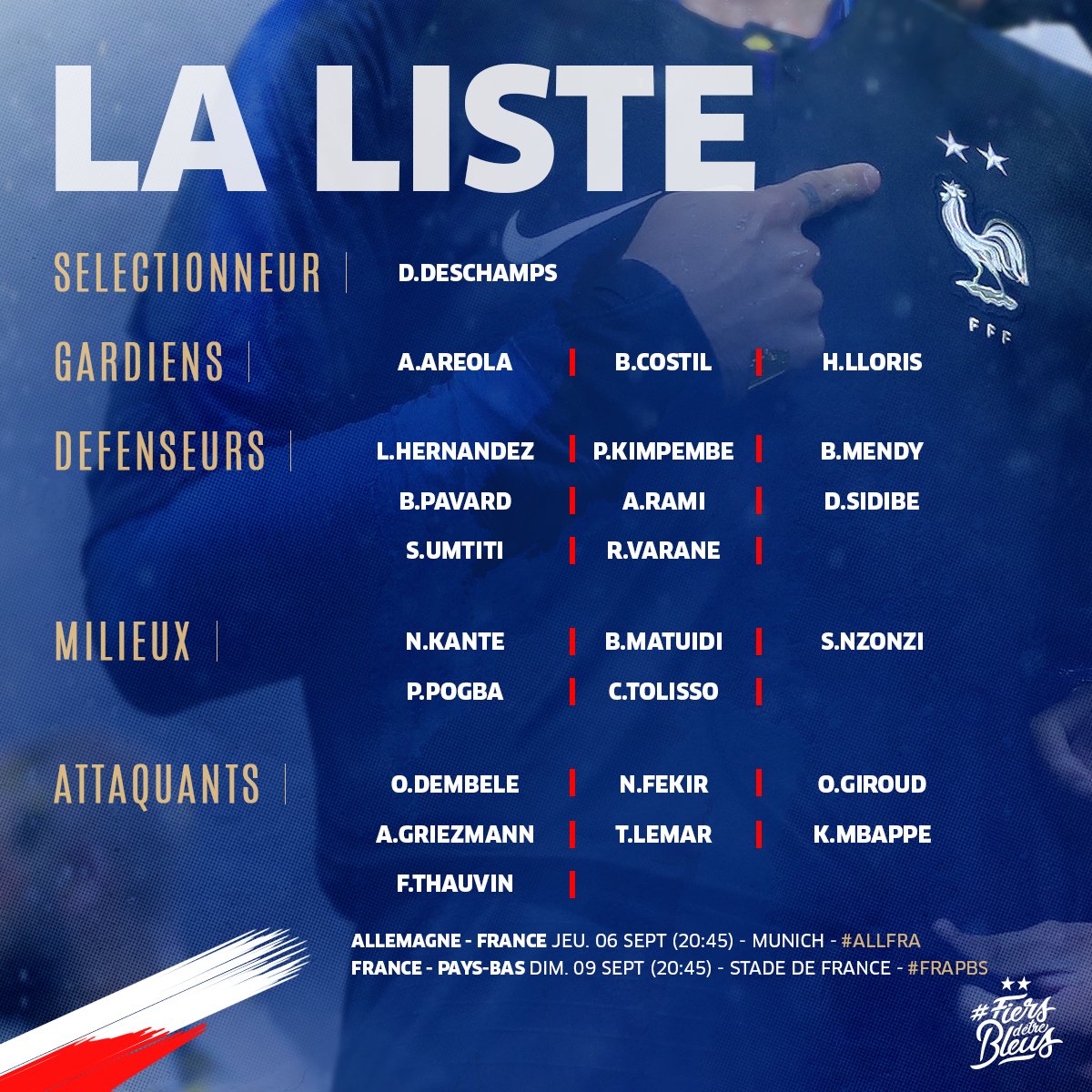 Ryhmässä ovat mukana kaikki MM-sankarit, paitsi loukkaantunut maalivahti Steve Mandanda. Hänet korvaa joukkueessa Bordeauxin 31-vuotias Benoît Costil. Ykköstorjujana, ja todennäköisesti edelleen myös kapteenina jatkaa rattijuopumuskärystään huolimatta Tottenhamin Hugo Lloris.