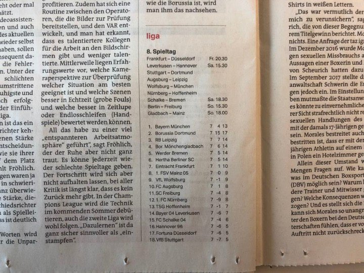 Rüttenauer jakoi julkaisussaan kuvan Bundesliigan sarjataulukosta, jossa Bayern oli nostettu kärkipaikalle, vaikka todellisuudessa joukkue oli seitsemän kierroksen jälkeen vasta kuudennella sijalla. Sama, tahallisesti virheellinen, taulukko pääsi lehden lauantain paperiversioon.