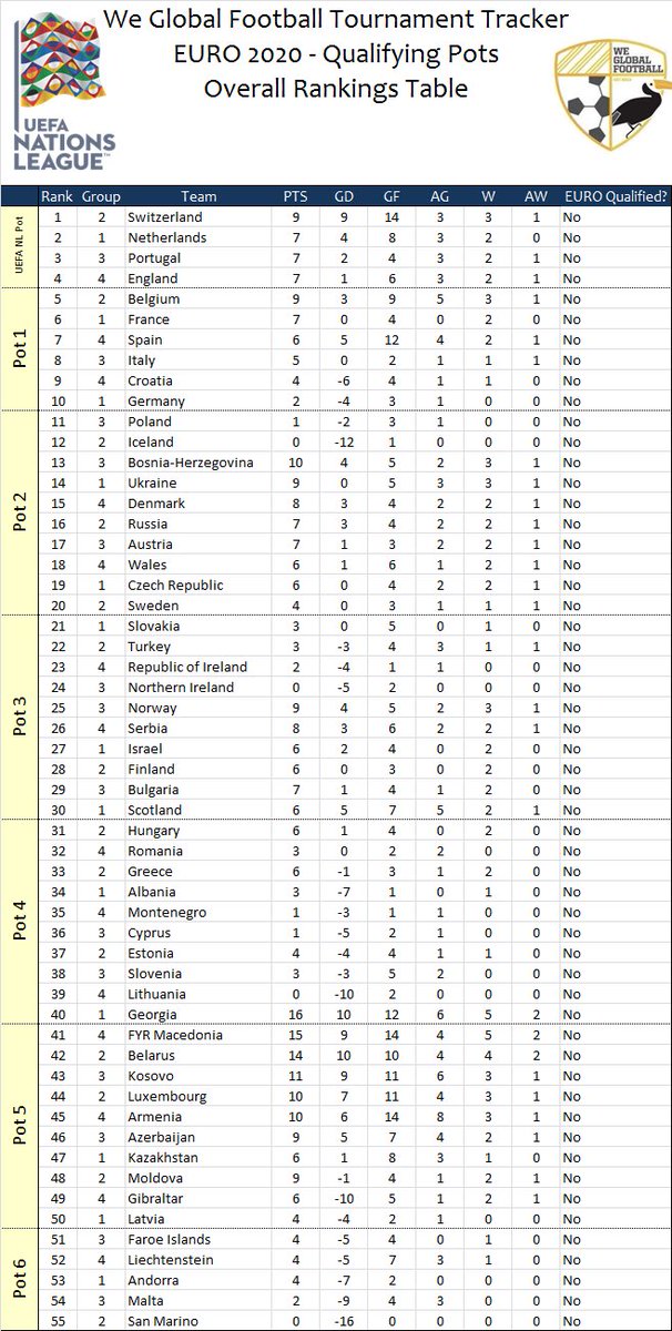 As it stands, these would be your EURO 2020 Qualifying Pots, for the draw to take place December 2nd. Germany would fall to Pot 2 (!) if Poland can get a draw at Portugal tomorrow.