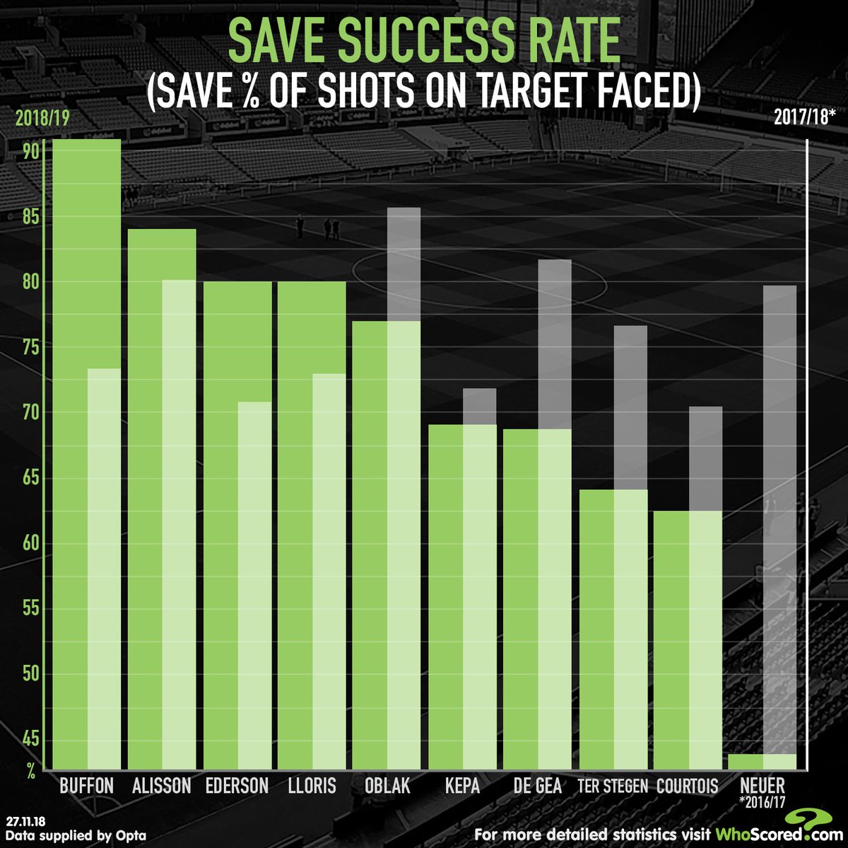 Manuel Neuer: Has as worse save success rate (43.8%) that any other goalkeeper in Europe's top five leagues this season