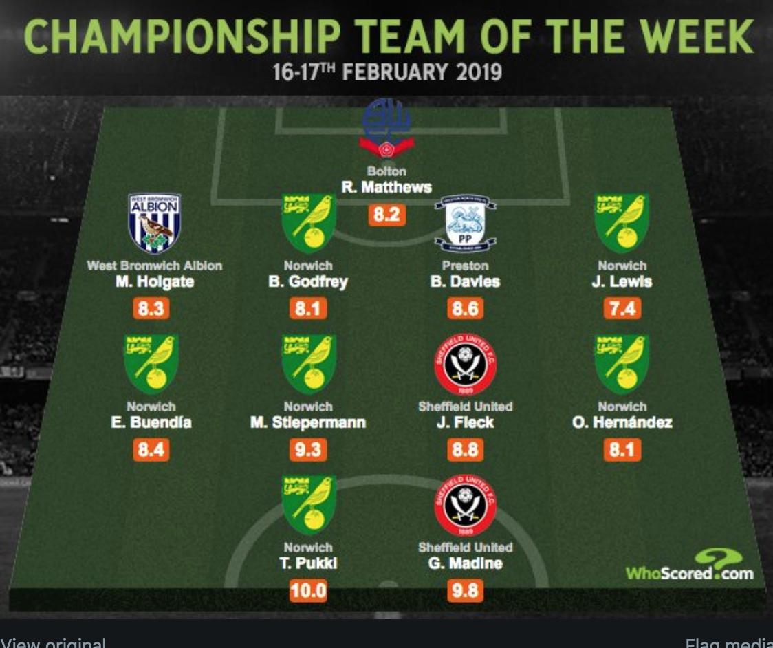 Pukki, 28, on yksi kuudesta Norwichin pelaajasta, jotka ovat mukana viikon joukkueessa. Hän on kuitenkin ainoa 11 pelaajasta, joka on saanut arvosanakseen täyden kympin.
