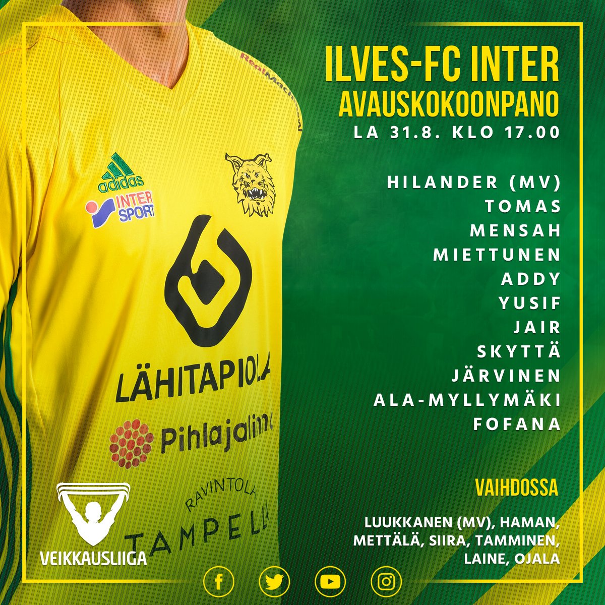 Kokoonpano Tammelassa pelattavassa kärkimatsissa!