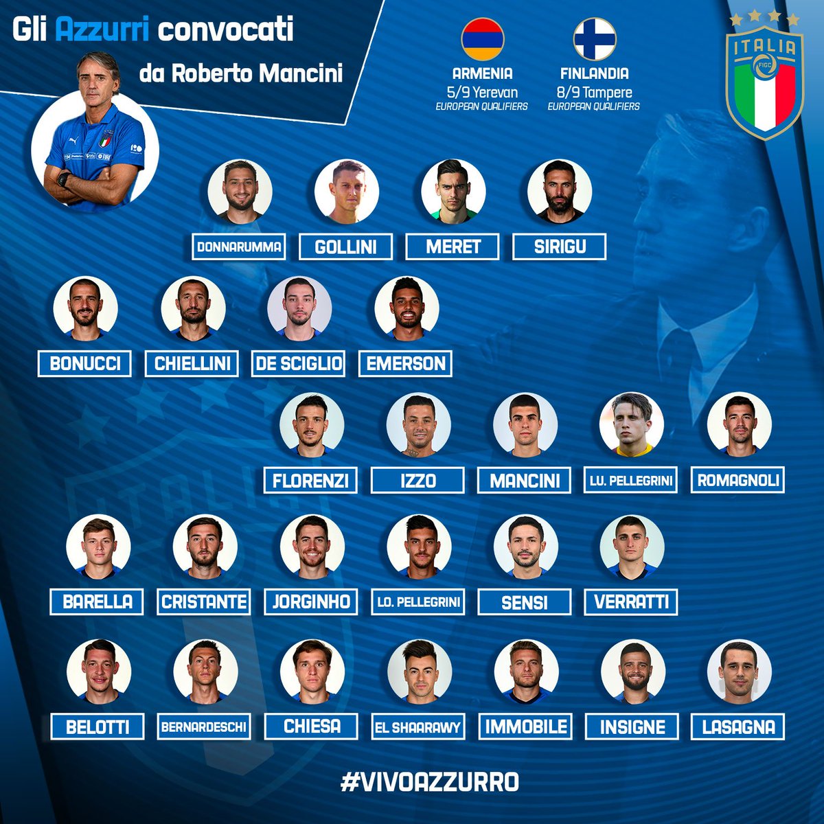Gli #Azzurri convocati dal ct Roberto #Mancini per le gare di qualificazione a #Euro2020 contro #Armenia