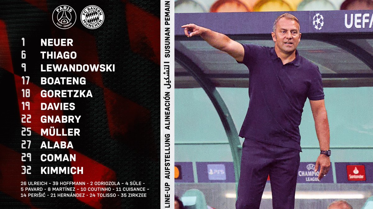 Bayern München lähtee loppuotteluun varsin yllätyksettömällä avauskokoonpanolla. Ainoa ero välierään on se, että Kingsley Coman korvaa Ivan Perisicin oikealla laidalla. Neuer Kimmich, Boateng, Alaba, Davies Alcântara, Goretzka Coman, Müller, Gnabry LewandowskiLUE MYÖS: