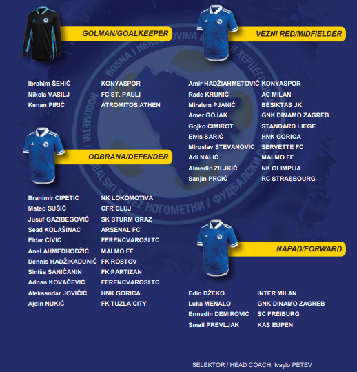 Suomen kanssa MM-karsintojen jatkokarsintapaikasta taisteleva Bosnia-Hertsegovina on nimennyt ryhmänsä kahteen viimeiseen karsintaotteluun.