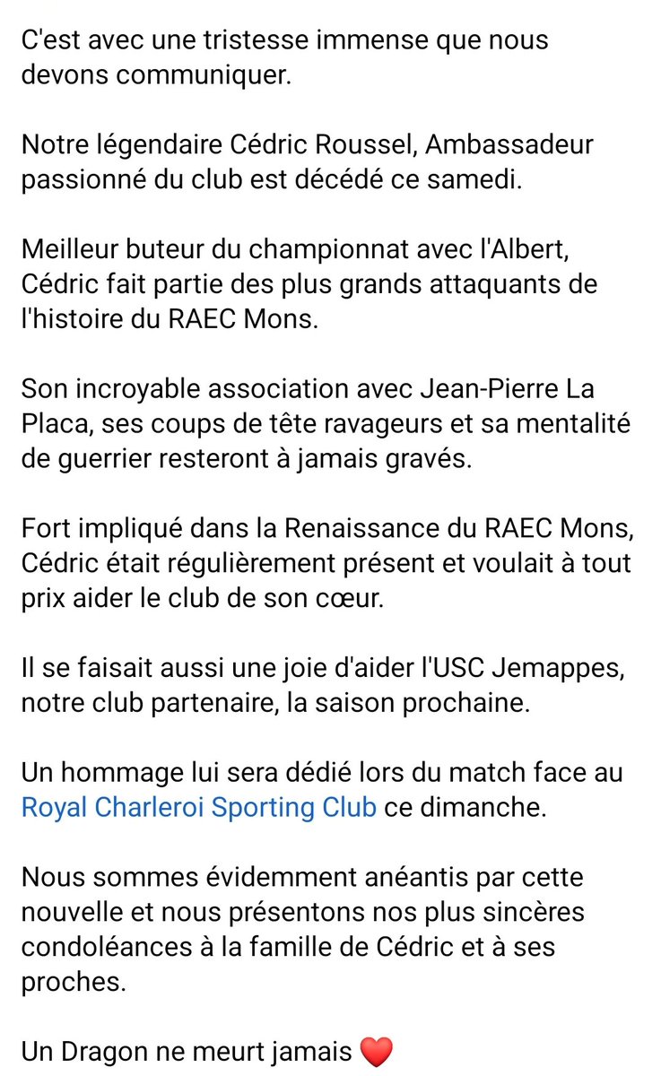 – Legendamme ja seuralähettiläämme Cédric Roussel menehtyi tänä lauantaina. RAEC Monsin perhe on järkyttynyt tästä uutisesta ja esittää vilpittömimmät osanottonsa Cédricin perheelle ja läheisille, kommentoi Rousselin entinen seura.