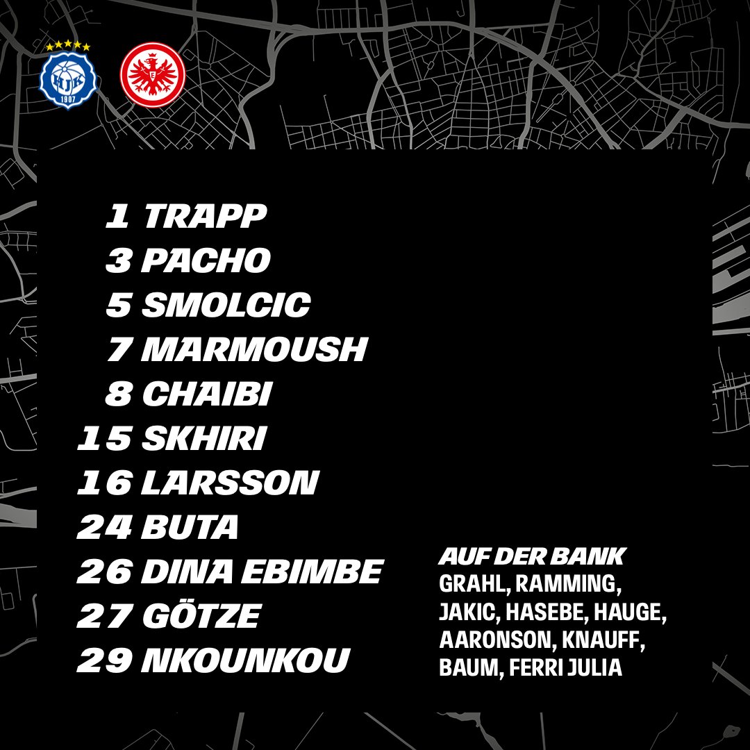 Avauksessa: Kevin Trapp (mv), Willian Pacho, Hrvoje Smolcic, Omar Marmoush, Fares Chaibi, Ellyes Skhiri, Hugo Larsson, Aurélio Buta, Junior Dina Ebimbe, Mario Götze, Niels Nkounkou