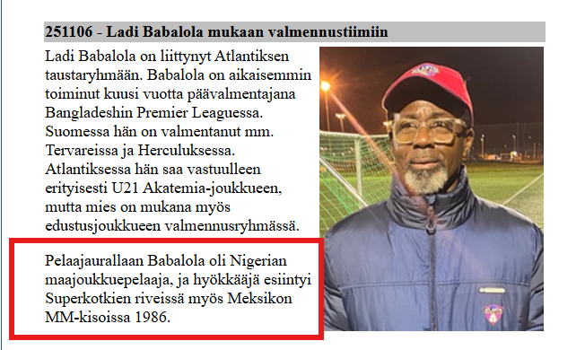 Marraskuussa julkaistussa tiedotteessa Atlantis kertoo nimekkäästä värväyksestä seuran taustajoukkoihin (ulkoinen linkki). Oladipupo ”Ladi” Babalola oli liittynyt alle 21-vuotiaiden joukkueen valmentajaksi. Atlantiksen mukaan Babalola oli entinen ”Nigerian maajoukkuepelaaja, ja hyökkääjä esiintyi Superkotkien riveissä myös Meksikon MM-kisoissa 1986”.
