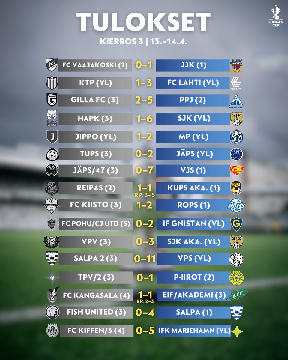 Viimeisimmät tulokset Suomen Cupissa